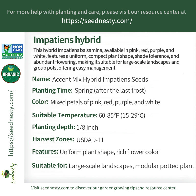 This hybrid seed mix features classic flower colors such as pink, red, purple, and white. All varieties have a uniform plant height (10-12 inches) and bloom at the same time, making them ideal for creating a neat and organized landscape. The plants are compact and well-branched, with small, emerald green leaves. When in bloom, the flowers almost cover the branches and foliage, forming a full, rounded head. It is shade-tolerant and suitable for low-light borders, balcony boxes, or indoor potted plants. Its continuous flowering period from spring to fall and harmonious color combinations create a rich, layered effect without elaborate design, making it an ideal choice for efficient landscaping.