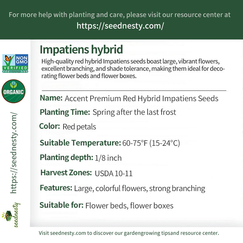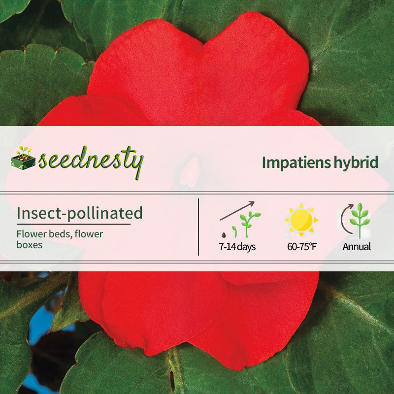 As high-quality hybrid Impatiens seeds, these plants produce vibrant red flowers with large, rich, lustrous colors, creating a striking visual impact. The plants exhibit excellent branching ability, vigorous overall growth, and a rounded, unspoiled shape. They are shade-tolerant and suitable for cultivation in low-light environments, such as indoor windowsills and under shaded garden trees. Whether planted in large flower beds or in containers like flower boxes and pots, these plants create a striking and vibrant addition to any landscape, highlighting a vibrant and bold style.