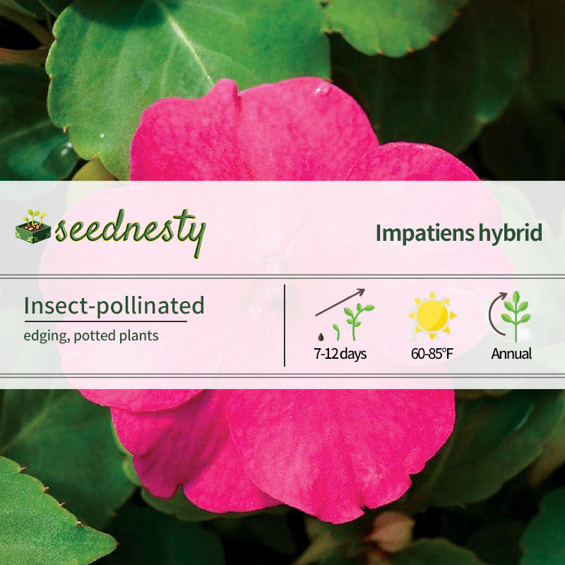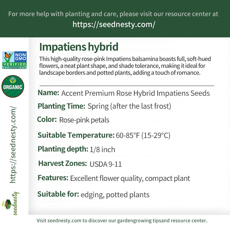This premium Impatiens balsamina cultivar, specializing in rose-pink, features a natural gradation from light to dark pink, thick, lustrous petals, and round, full blooms resembling miniature roses. The plant grows 10-12 inches tall, with a compact, uniform shape and even branching, making it suitable for large-scale landscape arrangements. It is shade-tolerant and blooms well in the shade or in diffused light indoors, blooming throughout the warm season. Whether used as a border for a flower bed or placed in a pot on a windowsill, its romantic pink color adds an elegant touch. Its dense blooms ensure a beautiful appearance with minimal maintenance.