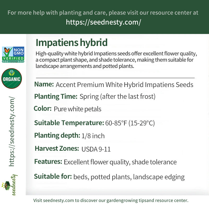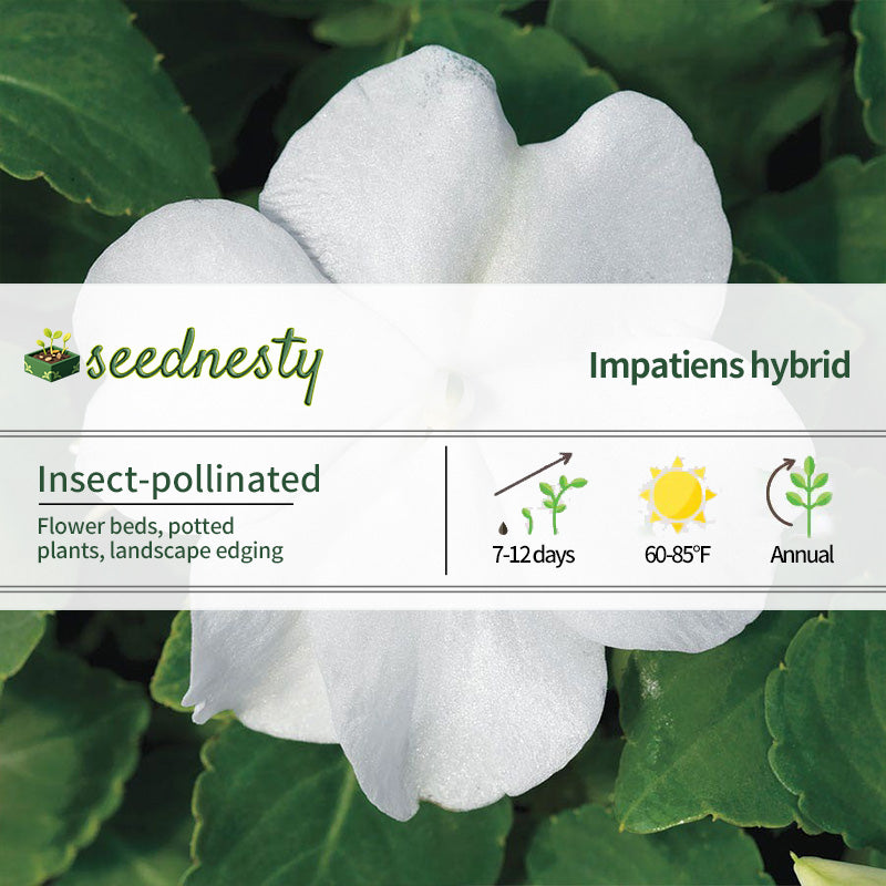 High-quality hybrid white Impatiens seeds focus on flower quality and plant shape. The flowers are pure white, large in diameter, and densely packed and full in bloom, making them highly ornamental. The plants grow neatly and with a uniform height, making them suitable for large-scale landscape arrangements such as flower beds and flower strips, and can also be used in pots to decorate indoor and outdoor spaces. They are shade-tolerant and can continue to bloom even in diffused light, making them an ideal choice for a clean and beautiful landscape.