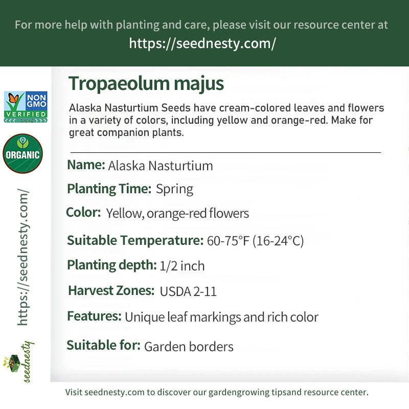 Plants grown from Alaska Nasturtium seeds are annuals that mature in 55-65 days. Their distinctive leaves appear to be dappled with cream paint, creating a mottled appearance. The plants are compact and the flowers come in a variety of colors, including  yellow and orange-red. They can be sown indoors 5-6 weeks before the last frost, or directly sowed outdoors in late spring. Sow at a depth of 1/2 inch and space plants 8-12 inches apart. They prefer full sun to partial shade, making them suitable for garden edges and companion plants for many plants.