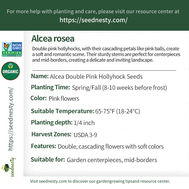 Alcea Double Pink Hollyhock Seeds are a delightful display of pink pom-poms in the garden. After sowing, the flower stems grow straight and sturdy, reaching 5-7 feet, providing sturdy support for the cascading petals. The dreamy double petals, each over 5 inches in diameter, resemble delicate hand-sewn petticoats. When in bloom, they resemble a plump, pink cloud cascading down the stem. Blooming in summer, the flowers are concentrated at the top of the stems. Ideal for planting in the centerpiece of a garden or in the mid-borders, they add a soft and romantic touch to the landscape, captivating passersby with their pink tenderness. They are a gardener's secret weapon for creating a charmingly girly garden.