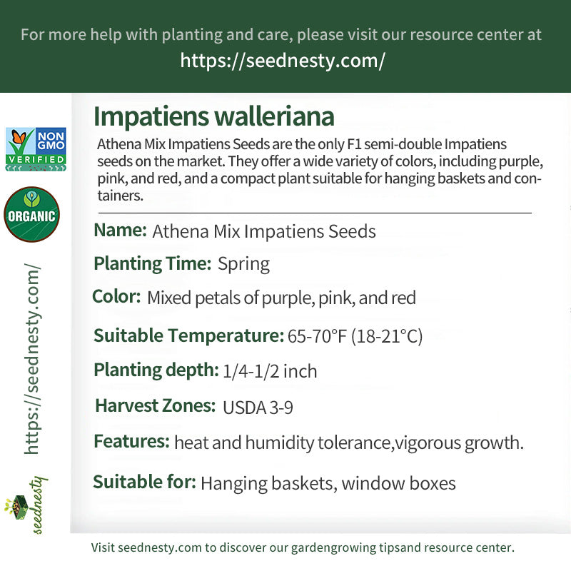 Athena Mix is a unique Impatiens seed with semi-double flowers, similar to miniature roses, in a variety of colors, including purple, pink, and red. The plant grows vigorously and spreads, reaching a height of 10-12 inches and a width of 14-16 inches. It tolerates heat and humidity well and thrives in partial shade, making it an ideal choice for hanging baskets, window boxes, and garden fronts, where it produces vibrant blooms from late spring until just before frost.