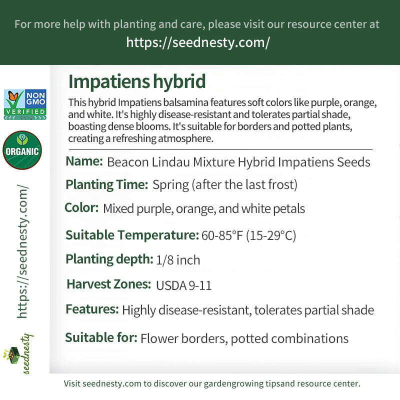 This hybrid cultivar combines soft colors like purple, orange, and white, each with its own delicate texture, creating a fresh, watercolor-like effect. As a member of the Beacon series, it offers exceptional disease resistance and strong resistance to common Impatiens diseases. It tolerates partial shade but blooms more luxuriantly in diffuse light or partial sun. Reaching a height of 10-14 inches, it maintains a regular shape and blooms continuously from spring to fall. Whether planted in a single planting in a border or arranged in pots to adorn a balcony, its soft colors create a tranquil atmosphere. Its rapid growth makes it a great choice for beginners to quickly establish a presence.