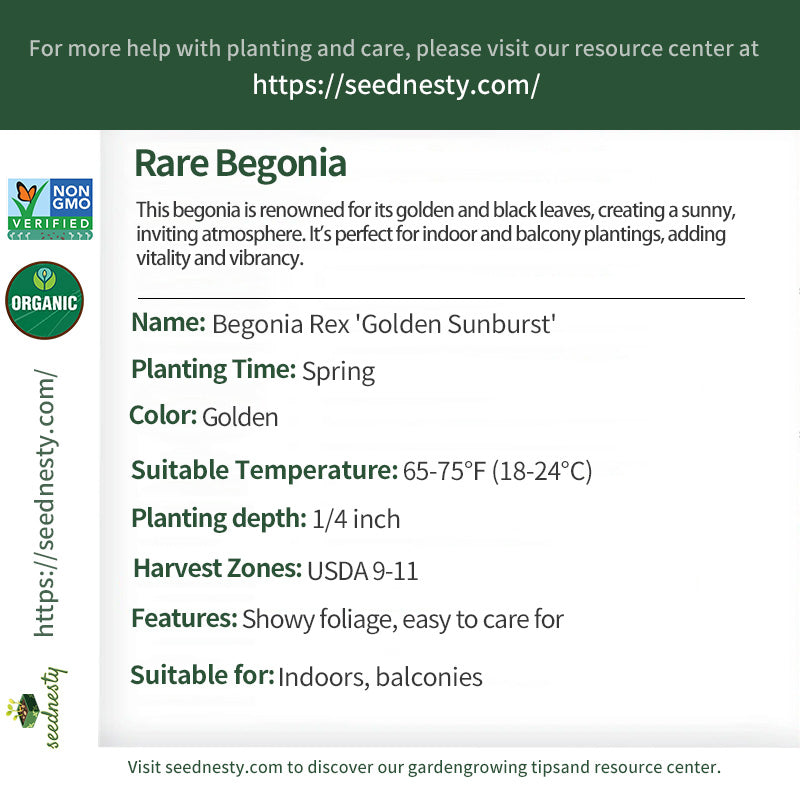 On a sunny morning, as you enter your garden, you're greeted by a riot of golden and green leaves, reminiscent of sunlight bathing the earth. Begonia Rex 'Golden Sunburst', with its unique color and resplendent appearance, becomes a star in your garden. Its leaves are like works of art, each awe-inspiring and captivating. This begonia is not only suitable for indoor decoration, but also for balconies. The gentle swaying of its leaves in the gentle breeze creates a sense of tranquility and beauty. Its easy cultivation makes it suitable for all gardening enthusiasts, making it a dazzling addition to your collection.
