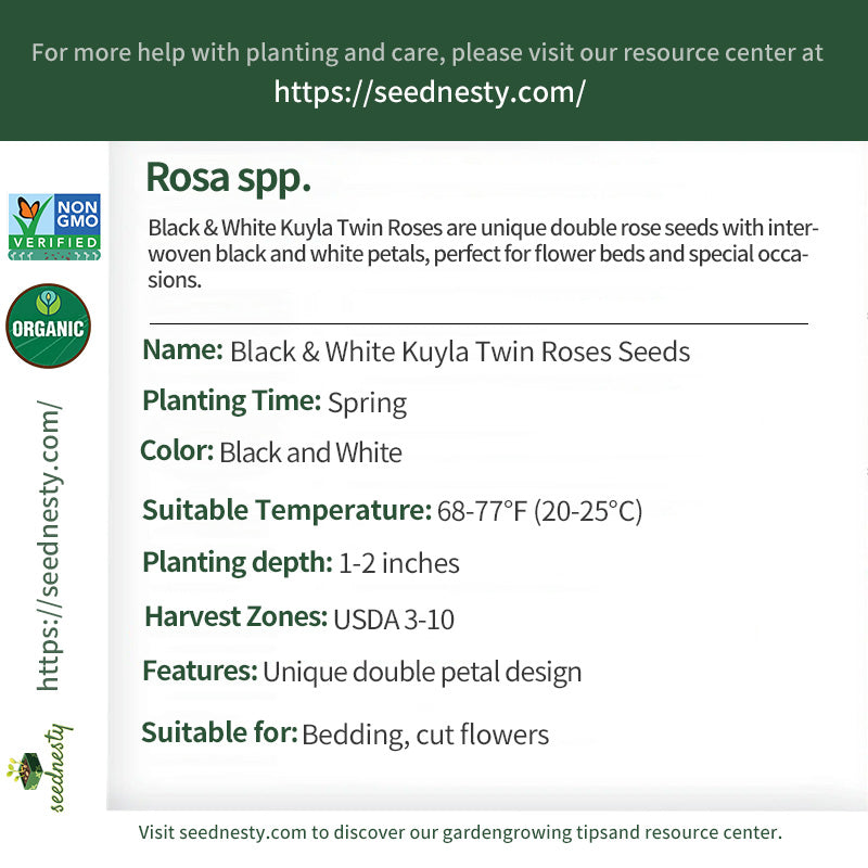 On a sunny morning, seeds from the Black & White Kuyla Twin Roses were sown in the garden. With the arrival of spring, the black and white double roses gradually blossomed, like a pair of twins nestled together, showcasing their unique charm. Their fragrance filled the air, attracting countless bees and butterflies. Neighbors flocked to admire the magnificent sea of flowers. Whenever the flowers bloomed, the garden was filled with laughter and joy, making it an ideal place for family gatherings. Black & White Kuyla Twin Roses are more than just plants; they symbolize uniqueness and harmony, adding infinite warmth to life.