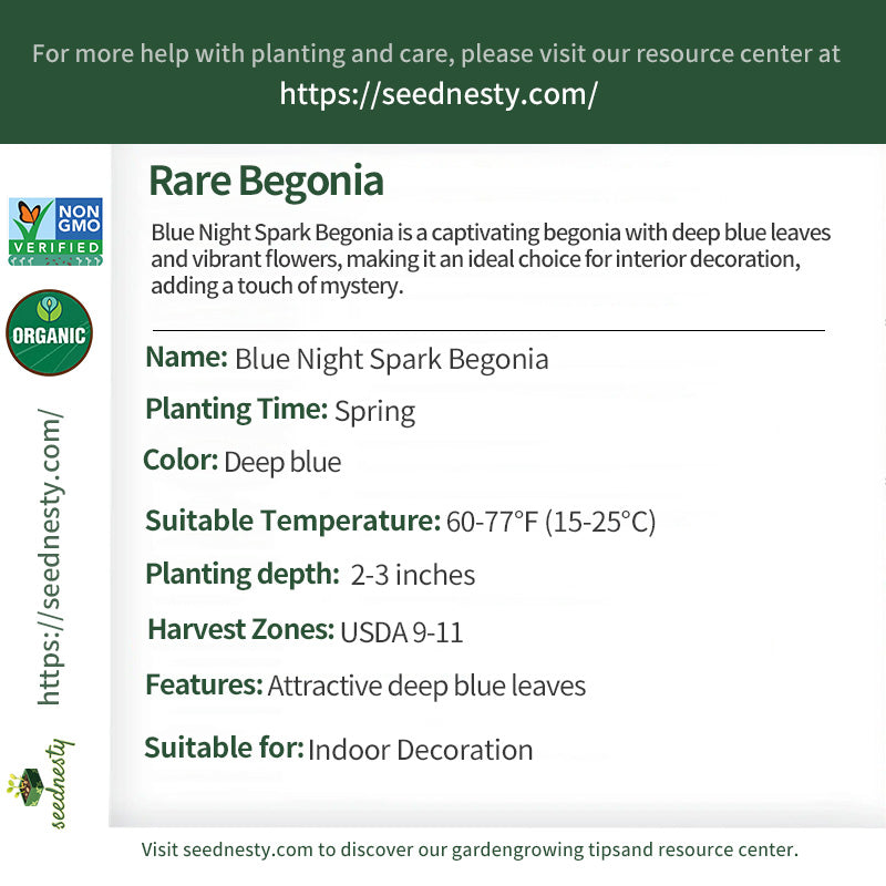 On a quiet evening, Blue Night Spark Begonia plants quietly sprout, anticipating their bloom. Over time, these begonias grow, revealing deep blue flowers that resemble stars in the night sky. Each flower exudes a unique fragrance, attracting insects and passersby. Blue Night Spark Begonia is not only an ideal choice for interior decoration, but also adds a touch of mystery and elegance to life. Their beauty and uniqueness make them perfect additions to homes and offices. Every time I see these flowers in bloom, I feel an endless surge of joy and gratitude, as if every moment of life is filled with surprise and beauty. Growing these begonias is like a conversation with nature, anticipating each bloom, bringing endless inspiration and emotion.