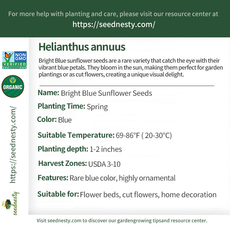 Under the sun, Bright Blue sunflower seeds quietly sprout in your garden, creating an unparalleled visual delight. Their blue petals are as clear as the sky, exuding a mysterious and elegant aura. Imagine admiring these unique flowers in the morning light, as if transported to a dreamy ocean of blue. Not only do they capture the eye, they also attract bees and butterflies, adding vibrant life to your garden. As cut flowers, Bright Blue sunflowers will add a unique touch to your home decor and become a hot topic at gatherings. Whether planted in a flowerbed or as a decorative indoor decoration, these sunflowers will bring endless surprises and joy.