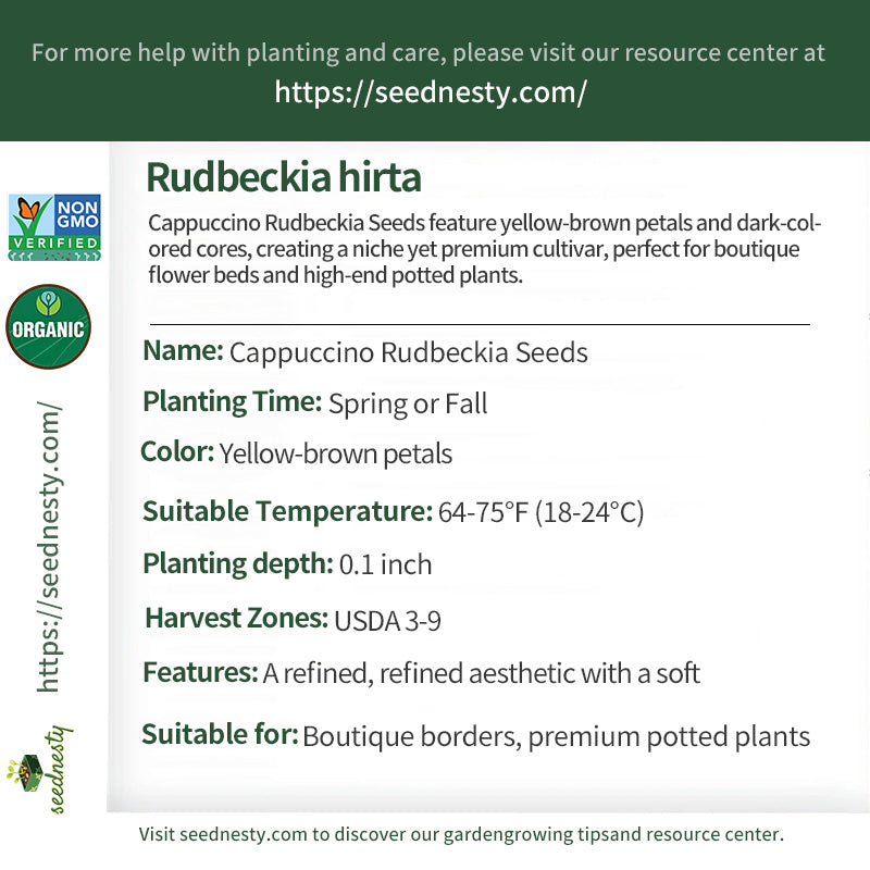 Cappuccino Rudbeckia is a niche premium cultivar among Rudbeckias. Plants grown from seeds have a distinctive yellow-brown color and dark-colored cores, creating a subdued, understated color while exuding a sense of sophistication. The flowers measure approximately 3-3.5 inches in diameter. The plants grow to a height of approximately 20-26 inches, with a slender yet upright stem and oblong, light green leaves. The plant maintains a loose yet dynamic form. It prefers full sun, is drought-tolerant, and tolerates mild infertility, blooming from mid-summer to early autumn.
