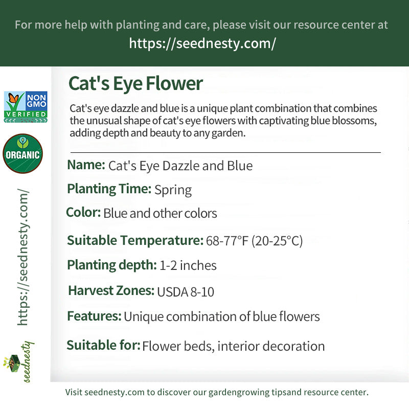 Cat's eye dazzle and blue stands out in the garden like a vibrant painting. The unique shape of the cat's eye flowers intertwined with the captivating blue blossoms creates a visual feast. Seeds are sown in spring, and as the sun shines, the flowers gradually bloom, attracting passersby to stop and admire them. Neighbors are often drawn to these unique plants, and children play happily among them, seemingly interacting with these remarkable plants. Whenever the flowers bloom, homes are filled with laughter, making them the perfect place for family gatherings. Cat's eye dazzle and blue is more than just a plant; it symbolizes vitality and energy, adding endless joy to life.