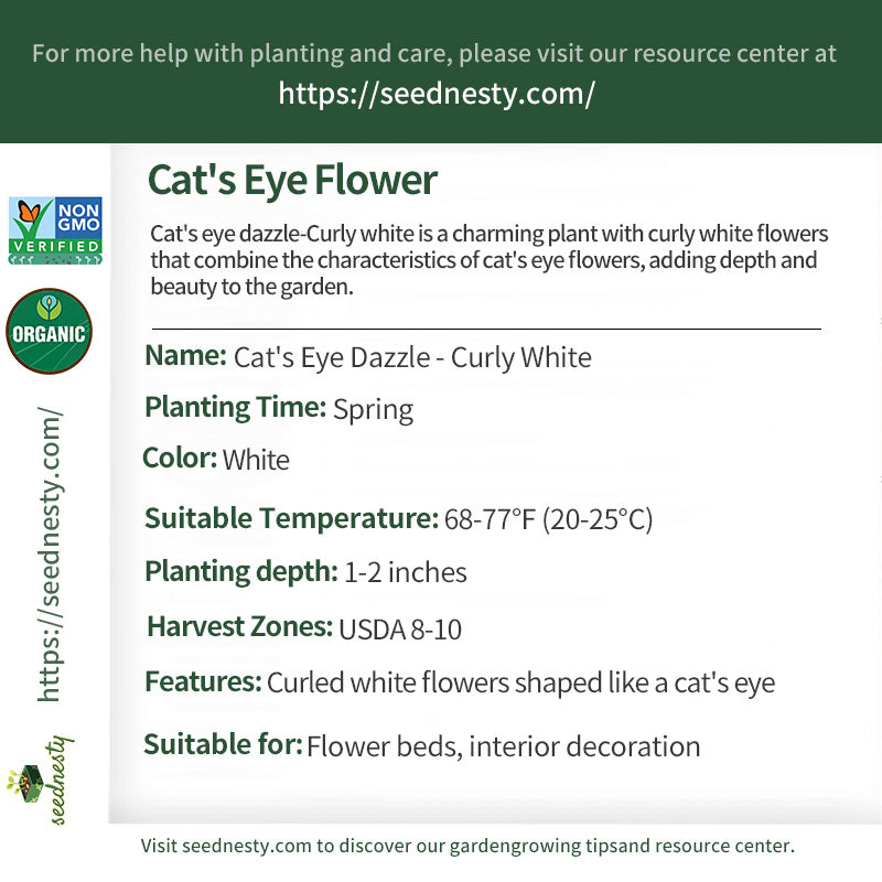 On a sunny spring day, seeds of cat's eye dazzle-Curly white were sown in the garden. Over time, the curly white flowers, resembling the shimmering beauty of cat's eyes, gradually grew. Their unique shape captivated passersby, who stopped to admire them. Neighbors were often drawn to these elegant plants. Children played happily among the flowers, seemingly interacting with these unique plants. Whenever the flowers bloomed, the home was filled with laughter and joy, becoming the ideal place for family gatherings. Cat's eye dazzle-Curly white is more than just a plant; it symbolizes elegance and beauty, adding infinite charm to life.