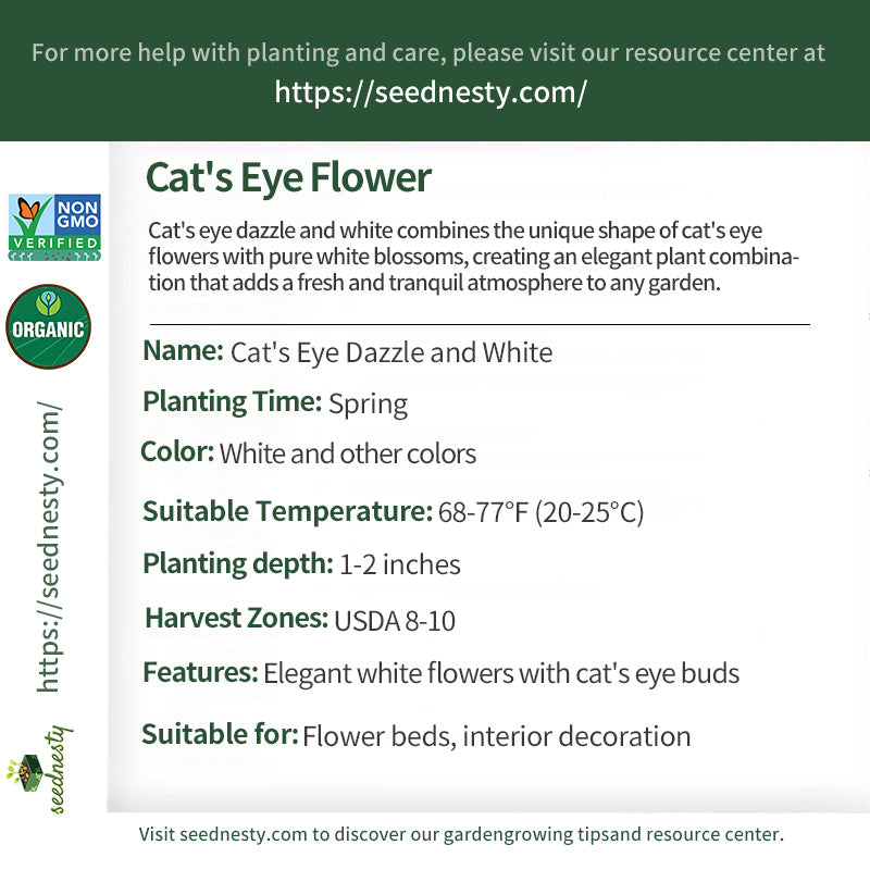 Cat's eye dazzle and white blooms in the spring sunshine, its pure white blossoms complementing the unique cat's eye shape to create a beautiful scene. The seeds quietly germinate in the warm soil, and as the sun shines, the flowers gradually open, attracting passersby to stop and admire them. Neighbors are often attracted to admire these elegant plants. Children play happily among the flowers, seemingly interacting with these unique plants. Whenever the flowers bloom, homes are filled with laughter and joy, making them the ideal place for family gatherings. Cat's eye dazzle and white is more than just a plant; it symbolizes tranquility and elegance, adding infinite charm to life.