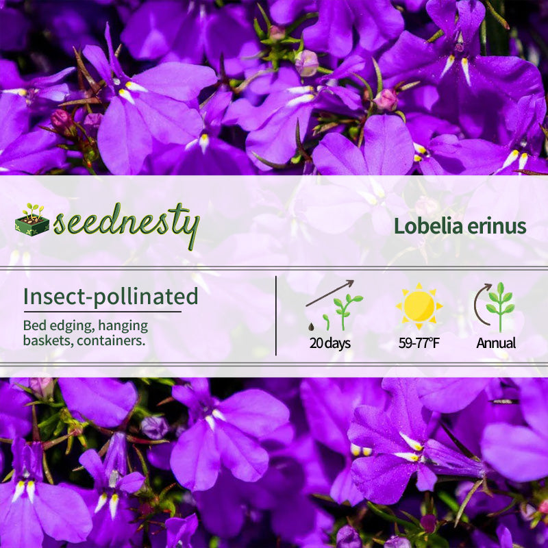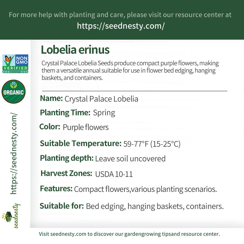 Crystal Palace Lobelia seeds produce compact purple flowers, making them an excellent annual for flower bed edging, hanging baskets, and container fillings. They thrive in cool weather, providing a stunning, dense display of rich color all season long. They are light-tolerant and can be attractive in full sun or partial shade, adding unique charm and texture to any garden.