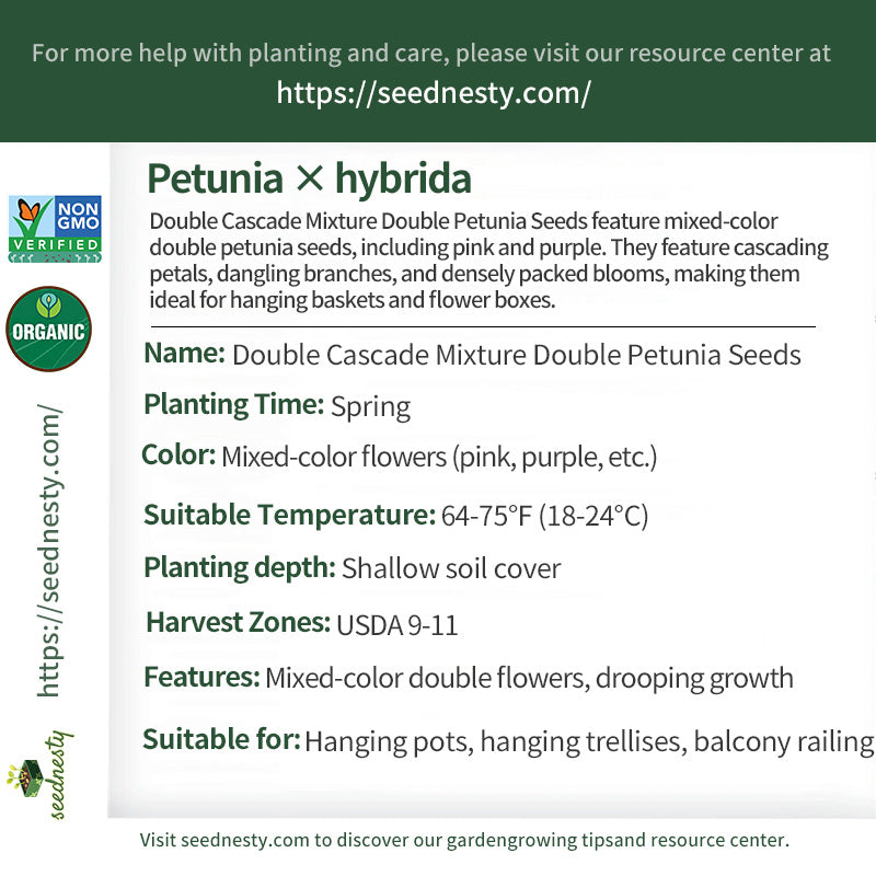 Double Cascade Mixture Double Petunia Seeds are mixed-color double hanging petunia seeds, featuring a variety of pastel shades, including pink and purple. Each plant features a random yet harmonious color palette, avoiding the monotony of a single color. The flowers are all double, with cascading petals resembling miniature roses, measuring approximately 2-3 inches in diameter. The thick petals are weather-resistant and resistant to breakage. The branches are dangling, reaching 35-45 inches in length. When hanging naturally, they form an elegant arc. When flowering, the flowers unfold layer by layer, descending from the branch tip to form a "cascade" of clusters. The plant grows quickly, blooming 10-12 weeks after sowing and continuing from spring to fall. Frequent pruning is unnecessary; simply remove spent flowers regularly to encourage new buds.