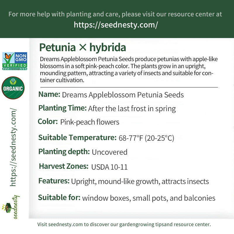 The flowers of Dreams Appleblossom Petunia seeds are the highlight of their plants. The trumpet-shaped flowers, up to 3 inches in diameter, are a soft pink-peach color, reminiscent of apple blossoms. They are fresh and elegant, radiating a captivating luster in the sun. The plants grow in an upright, mounding pattern, typically 10-15 inches tall, with evenly branched branches. The overall shape is compact and attractive, requiring little pruning to maintain a well-shaped plant. The smooth, light green, oval leaves complement the delicate blooms, further accentuating their beauty. Starting in mid-spring, the flowers bloom continuously until the end of summer. The abundant blooms attract bees, butterflies, hummingbirds, and other insects, adding vibrant life to the garden.