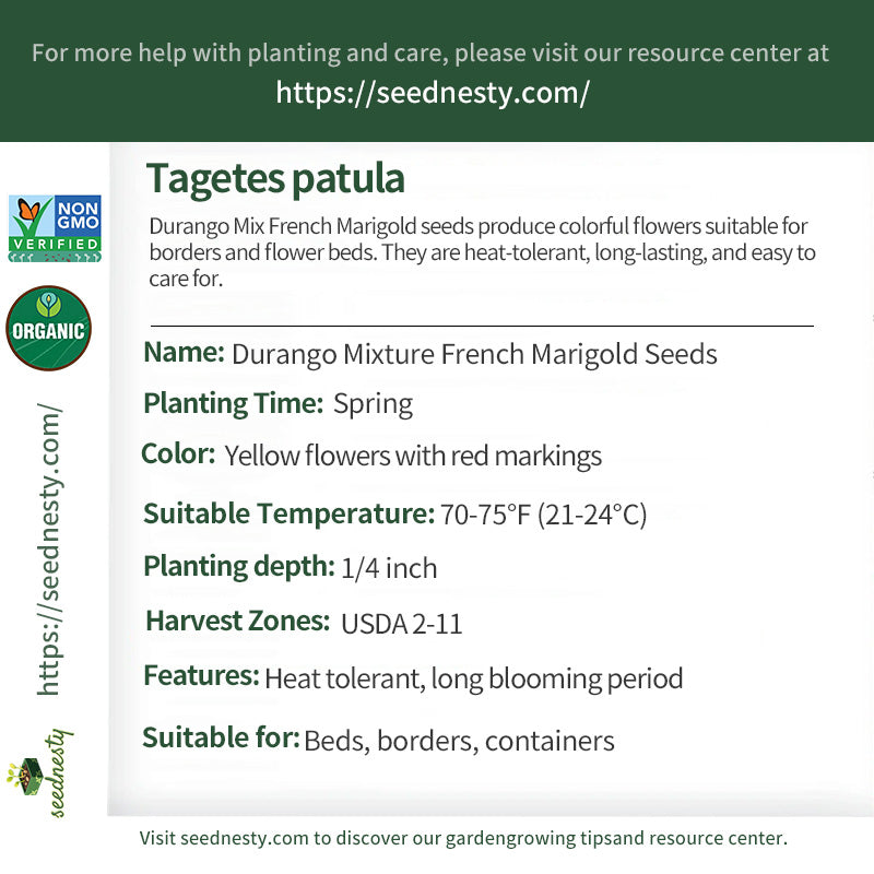 Durango Mix French Marigold seeds are a premium marigold seed mix that produces a variety of colors, suitable for a variety of garden designs. These plants are hardy and heat-tolerant, surviving in high temperatures. Their long flowering period, lasting from summer to autumn, adds color to flower beds and borders. Durango marigolds require only full sun and moderate water for easy care. They are not only ornamental but also attract beneficial insects, making them an ideal gardening choice.