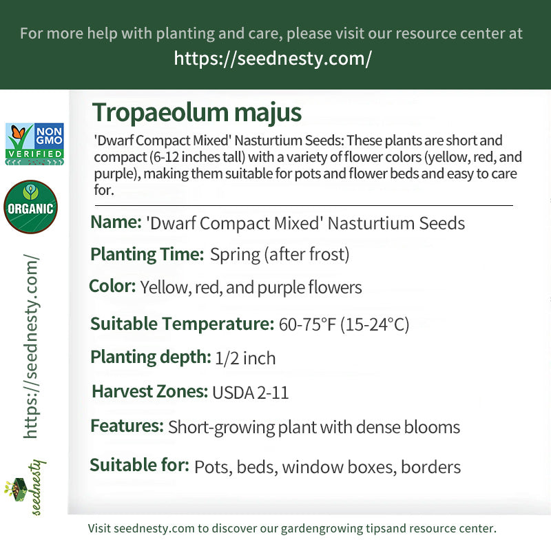 'Dwarf Compact Mixed' Nasturtiums are compact (6-12 inches tall) and don't take up much space, yet they produce a profusion of flowers. Their blooms range from yellow, red, and purple, and their simple, bright single petals harmonize harmoniously with the rounded leaves (blue-green or bronze). They are suitable for dense planting in small pots, window boxes, or as a color-blocking filler in flower beds. They are vigorous and tolerant of poor soils. They bloom 5-7 weeks after sowing and continue to bloom without fertilizer, making them a must-have seed for beginners looking for quick results.