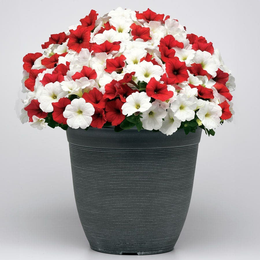 E3 Easy Wave Peppermint Mix Petunia Seeds produce plants with striking flowers. The flowers exhibit a unique blend of red and white, making them stand out among other flowers. The plants exhibit excellent growth characteristics and are known as "Extra Easy," allowing them to successfully grow with lower concentrations of plant growth regulators (PGRs) than standard Easy Wave varieties, reducing both the difficulty and cost of cultivation. The plants exhibit neat, uniform structure and vigorous growth, maintaining a full, lush appearance for extended periods at retail.