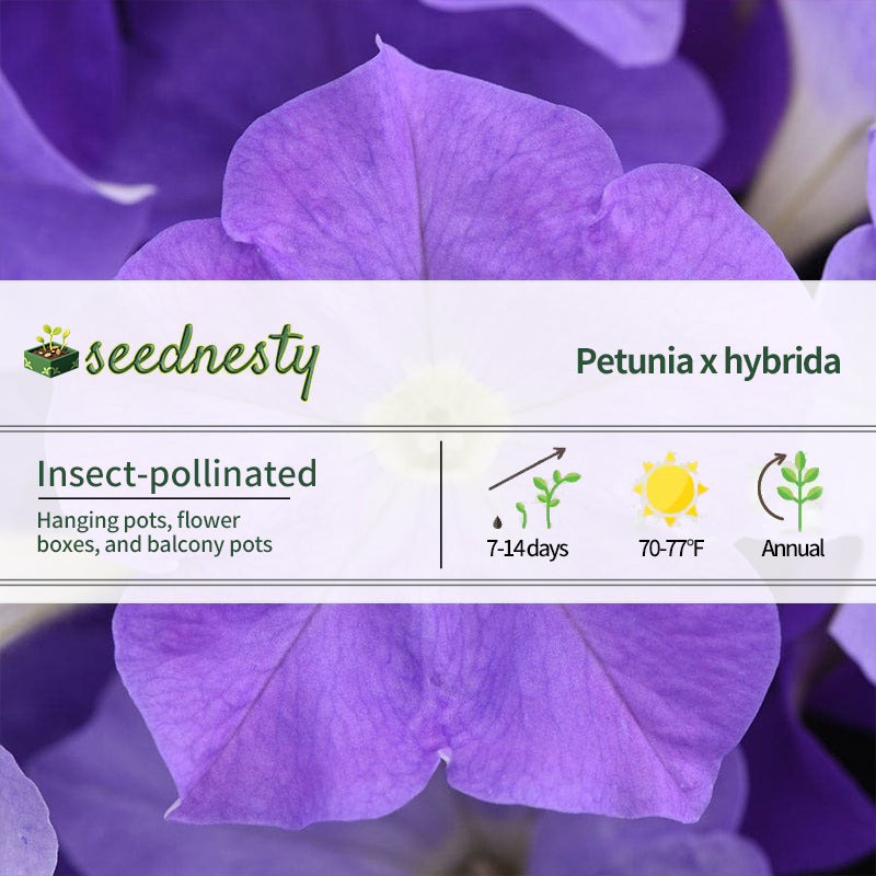 Sky Blue Petunia seeds are ideal for creating "flower waterfall" landscapes. Plants grown from seeds are highly creeping, with flexible, densely branched branches that naturally droop or cover the ground without manual support, creating a lush "carpet" or "waterfall" effect. The flowers are a pure, bright, uniform purple with no variegation or spots. They measure approximately 3-4 inches in diameter, with thick, firm petals. They are sun- and rain-resistant, resisting fading and rotting after high summer temperatures or brief rainfall. This variety is highly adaptable, blooming most profusely in full sun but also tolerant of light to partial shade. It is also suitable for growing in ordinary garden soil and blooms from late spring until just before frost in autumn, with new buds continuously emerging.