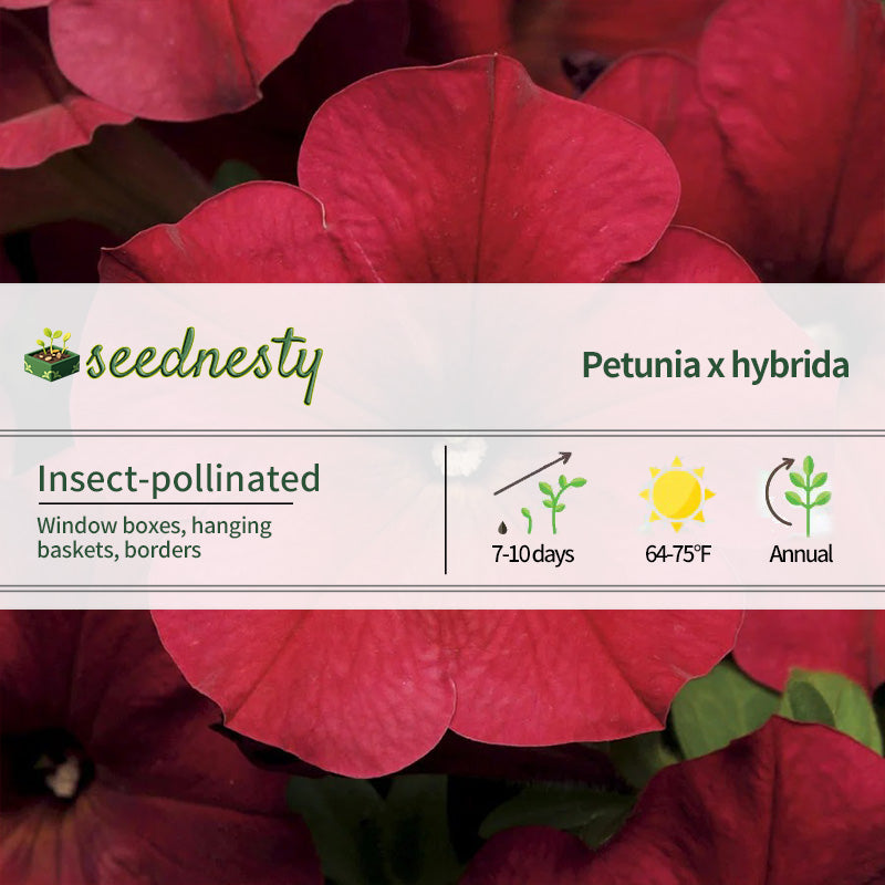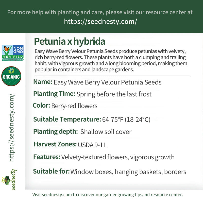 Easy Wave Berry Velour Petunia Seeds produce petunias with a unique velvety texture and a rich, lustrous berry-red color. These plants have both a clumping and trailing habit, reaching heights of 6-12 inches and widths up to 39 inches. They grow quickly and branch prolifically, quickly filling containers or covering the ground. Their blooms last from early summer to early fall, with abundant blooms, and new flowers continuously emerging from the center and tips of the stems, ensuring a constant fresh appearance. They are highly adaptable, tolerant of both heat and some cold, and thrive in full sun. They are often used in window boxes and hanging baskets to create a dazzling waterfall of flowers, or planted in borders to create a vibrant, vibrant landscape.