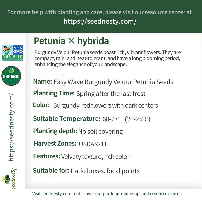 Easy Wave Burgundy Velour Petunia seeds feature a rich burgundy color and velvety texture. The flowers are 2-2.5 inches in diameter, with deep burgundy petals covered in fine hairs that give off a soft, velvety sheen in the sun, creating a luxurious and textured look. The plants are compact, 6-10 inches tall, with even branches and minimal legging, making them suitable for potted plants or densely planted in flower beds. The glossy, deep green leaves create a striking contrast with the burgundy flowers, further highlighting their rich color. This variety is rain- and heat-tolerant, with flowers that retain their color even in the summer heat. The blooms continue from late spring to early autumn, with a consistent blooming period.