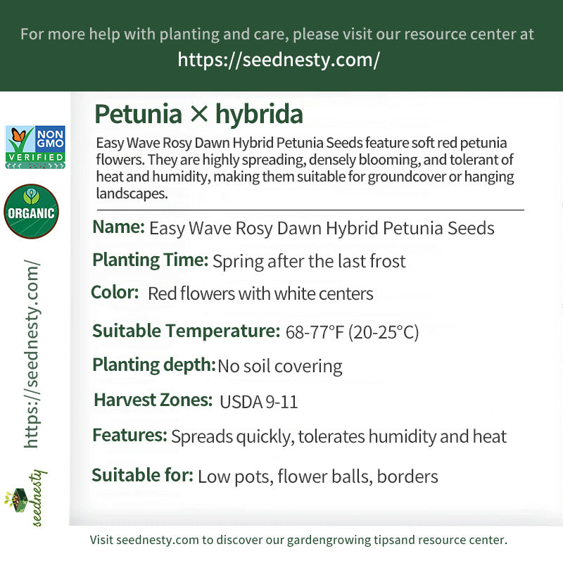 Easy Wave Rosy Dawn Hybrid Petunia Seeds stand out with their distinctive red color. The petals have a subtle blush around the edges, creating a rich, lush color that resembles a rosy morning glow. Continuing the excellent spread of the Easy Wave series, the plants reach a height of 6-10 inches and can spread 20-24 inches horizontally, making them a great choice for quickly covering groundcover or container surfaces. Their thick, dark green leaves tolerate heat and humidity, resisting yellowing during heavy summer rains. The flowers are densely blooming, with new blooms continuously appearing from late spring to early fall.