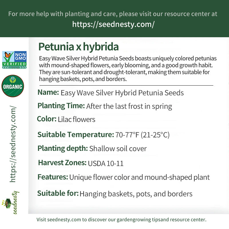 Easy Wave Silver Hybrid Petunia Seeds boasts unique lavender flowers and a mound-shaped growth pattern. They bloom early and exhibit a good growth habit throughout their growth, showing strong sun and drought tolerance. They reach a moderate height, typically 6-12 inches, providing ample coverage. Whether planted in hanging baskets, where their branches droop naturally, creating a beautiful landscape, in pots on balconies and windowsills, or as borders for flower beds, their unique flower color and excellent growth pattern add a touch of charm to any garden.