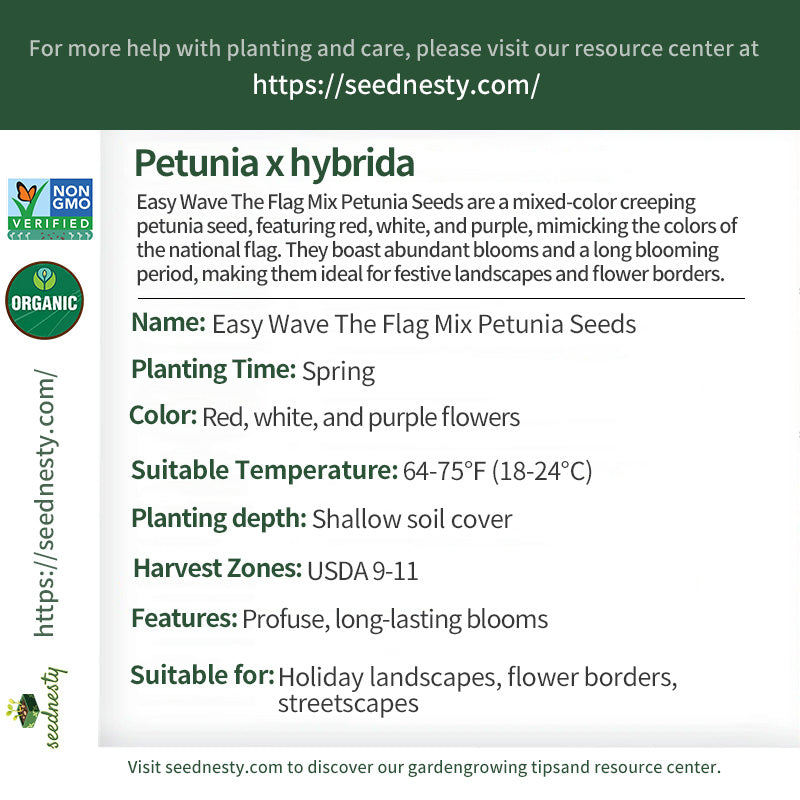 Easy Wave The Flag Mix Petunia Seeds are a mixed-color petunia seed designed specifically for festive landscapes. Comprising pure red, pristine white, and refreshing purple, they cleverly mimic classic color schemes, creating both ornamental and thematic elements. The plant inherits the creeping habit of the Easy Wave series, boasting numerous branches and rapid growth, with branches extending to over 30 inches. The plant produces numerous flowers, with dozens blooming simultaneously on a single plant, and their flowering period lasts from spring to autumn. They are sun-resistant and rain-resistant, making them less susceptible to inclement weather. Whether used in flower borders for holidays like National Day and Independence Day, or in everyday garden landscapes featuring "national flag" elements, the red, white, and purple color combination creates a warm and solemn atmosphere.