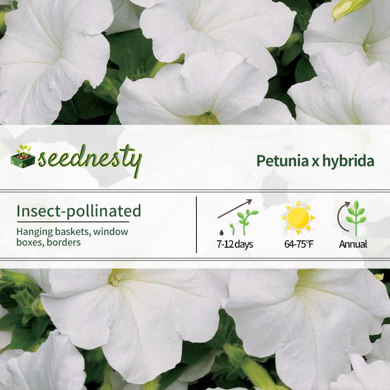 Easy Wave White Petunia Seeds cultivates petunias that combine clumping and creeping characteristics. Their pure white flowers, up to 3 inches in diameter, are abundant and bloom continuously from late spring to early fall. The plant's strong branching ability allows it to naturally develop a full, neat shape without extensive pruning. Its branches can reach over 3 feet, effectively covering the ground or draping over the edges of containers. They are highly adaptable, tolerant of both heat and some cold, and thrive in full sun or partial shade. Perfect for creating romantic waterfalls in hanging baskets and window boxes, or planted in the ground along borders, this plant adds a touch of pure, soft color to any landscape.