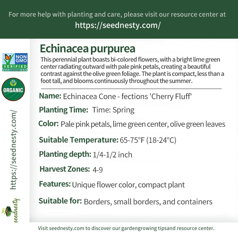 In a quiet small town, there lived an elderly man who loved gardening. His small garden was a source of joy. He once saw Echinacea Cone-fections 'Cherry Fluff' at a flower show and was captivated by its unique bi-colored blooms. Upon returning home, he eagerly planted the seeds. Day by day, the seeds sprouted and the plant grew compact and lush. When it bloomed, the bright lime green center, paired with pale pink petals, contrasted beautifully with the olive green foliage, resembled a meticulously painted painting. All summer long, these lovely flowers bloomed in unison, adding a touch of warmth and romance to the man's small garden.