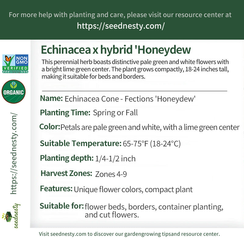 In a quiet country garden, a gardener was struggling to find a fresh, fresh addition. He stumbled upon Echinacea Cone - Fections 'Honeydew'. After planting the seeds, tender green shoots emerged. Over time, the plant flourished, becoming compact and full. When the first flower bloomed, he was captivated by its refreshing, honeydew-like color. The interwoven pale green and white petals, framed by a bright lime green center, resembled a masterpiece meticulously crafted by nature. These flowers bloom continuously throughout the summer, bringing a unique sense of tranquility and freshness to the garden, creating a truly unique addition.