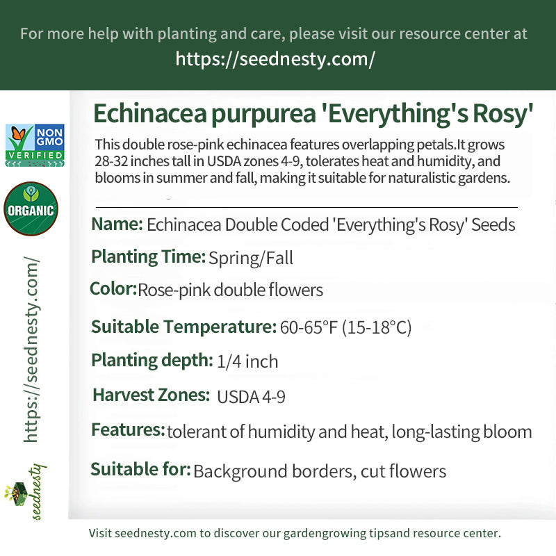 This double rose-pink echinacea grows 28-32 inches tall with overlapping petals and a pink-green center. The flowers are 4-5 inches in diameter. It tolerates heat and humidity in USDA zones 4-9, in full sun or partial shade, and prefers soil rich in organic matter. Germination occurs 21-28 days after sowing (at 60-65°F), and a 1/4-inch cover should be applied. The mature plant is robust and resistant to pests and diseases. It blooms from summer to fall, and pruning after flowering can encourage a second bloom. It is suitable for naturalistic gardens, borders, or paired with purple sage to create a soft pink landscape.