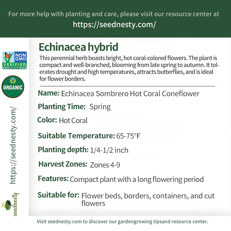 The small town's community garden always lacked a touch of color, so gardening volunteers planted the Sombrero Hot Coral Coneflower. In late spring, buds sprout from tender green branches, and soon after, the hot coral-colored flowers burst into bloom, resembling countless tiny suns hanging from the branches, their copper-colored discs hidden within, attracting flocks of butterflies. From late spring to late autumn, the blooms bloom one after another, painting the corners of the garden a warm coral sea. Children love to squat beside the flowers and count the butterflies, and this bright color has become the most vibrant part of the community's scenery.
