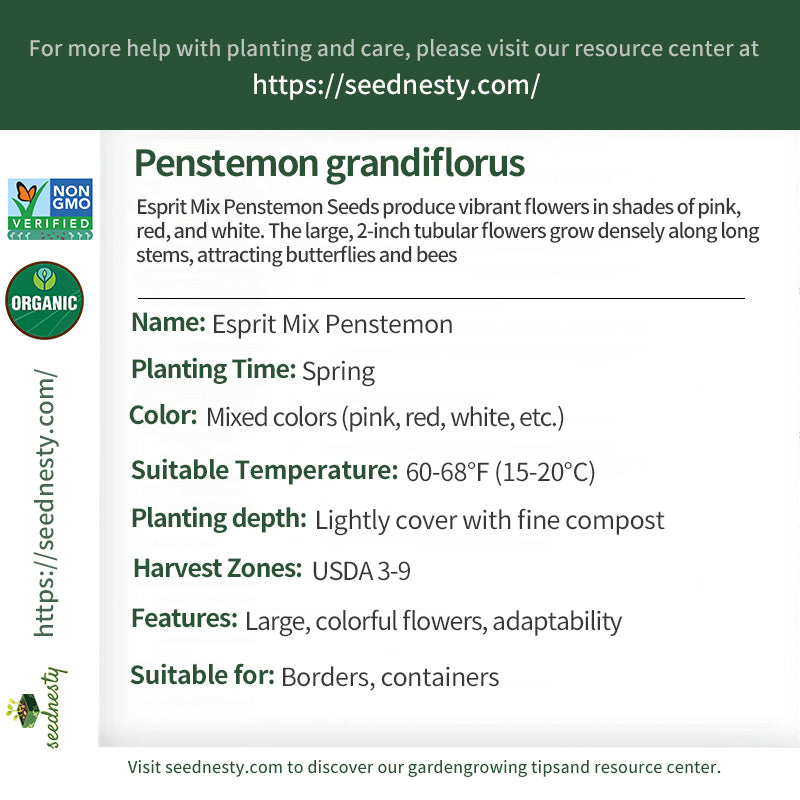 Esprit Mix Penstemon Seeds is a perennial herb (it can be grown as an annual in less cold-hardy zones). If sown early, it blooms in its first year. The flowers range in color from pink to red to white, adding to its unique charm. The 2-inch tubular flowers are tightly packed on long, persistent stems, and the plant reaches 24 to 30 inches in height when in bloom. Native to the Great Plains, it adapts to dry soils, requires minimal fertility, and tolerates heat and drought. Silvery-green leaves form a neat rosette beneath the flowers. It is an evergreen in mild climates and performs well in containers or in sunny borders.
