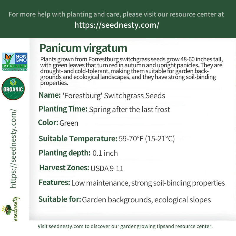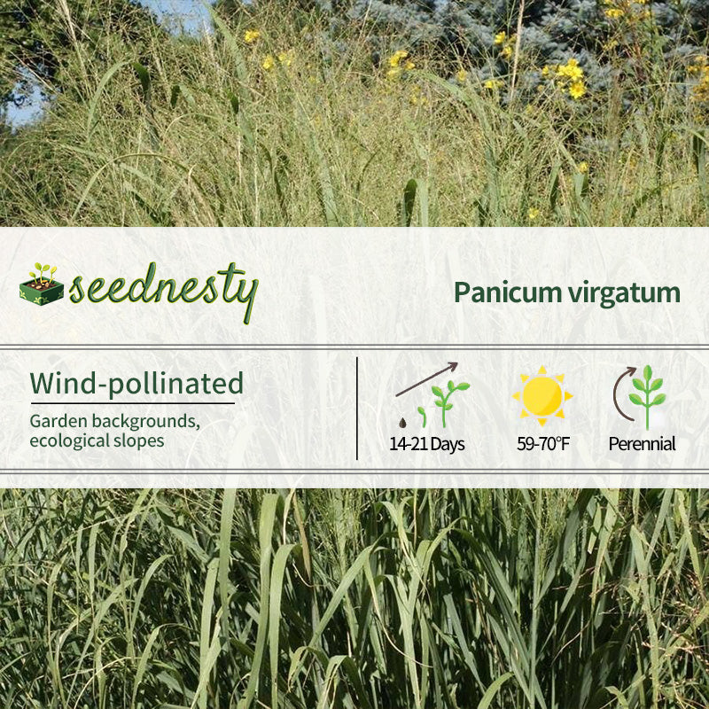 Forrestburg switchgrass seeds are a herbaceous variety with both ecological and ornamental value. They grow 48-60 inches tall, with upright, sturdy stems and smooth, linear, dark green leaves. They form dense, lush "grass patches," providing shade in summer and a natural color transition. In late summer and early autumn, upright panicles emerge, with densely arranged spikelets that rise above the leaves, giving them a light, airy appearance in sunlight. This variety is extremely cold-tolerant, tolerating temperatures as low as -34°C, and is also drought-tolerant and poorly infertile. It has a moderate soil requirement, growing in both sandy and clay soils. Its well-developed root system provides excellent soil-binding and slope-protecting properties.