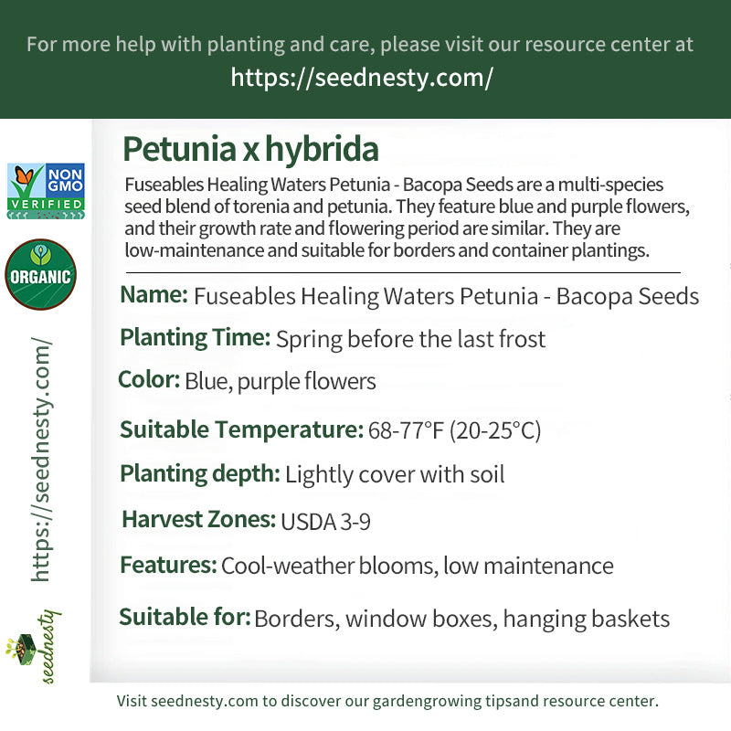 Fuseables Healing Waters Petunia - Bacopa Seeds are a multi-species seed blend. Plants grown from this blend have a relatively consistent growth rate and a roughly synchronized flowering period, blooming continuously from late spring to autumn. The flowers, primarily blue and purple, create a cool and soothing visual experience. Plants typically grow 6-12 inches tall and can reach a width of 30-36 inches. They require minimal care and thrive in full sun and well-drained soil. They are suitable for borders, creating a natural and harmonious landscape. They can also be used in various containers to decorate balconies and patios.