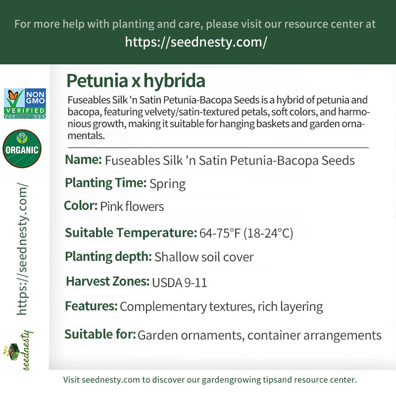 Fuseables Silk 'n Satin Petunia-Bacopa Seeds is a hybrid of petunia and bacopa, with harmonious growth habits that create a naturally harmonious landscape. The petunia's velvety petals offer a striking yet complementary texture, while the predominantly soft pink color creates a fresh and elegant overall palette without any jarring color clashes. The plant reaches a height of approximately 6-10 inches, with the petunia's slightly creeping branches and the bacopa's slender, drooping branches. When planted together, they create a "staggered" effect. They are highly adaptable and can grow in light shade or full sun, blooming from late spring to fall. They require minimal pruning and are easy to care for.