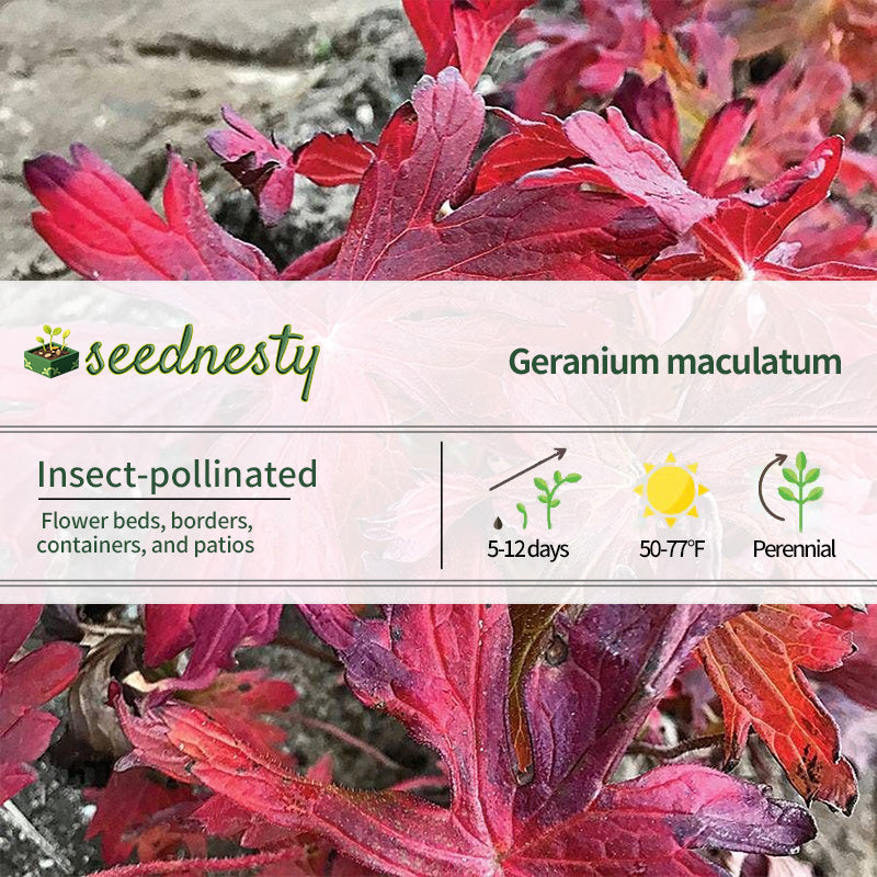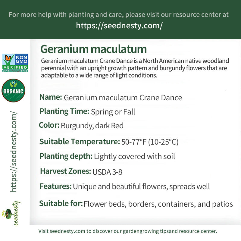 Geranium maculatum Crane Dance has an upright growth pattern and a unique beauty. Its leaves appear bronze in early growth, but as the seasons change, its flowers transform into vibrant burgundy and crimson, creating a striking contrast against the emerald green foliage. This cultivar, a North American native woodland perennial, is highly adaptable and can grow in a wide range of light conditions, from full sun to open areas to partially shaded woodland edges. Its flowers bloom continuously from late spring to midsummer, adding a refreshing and unique touch of color to any garden.
