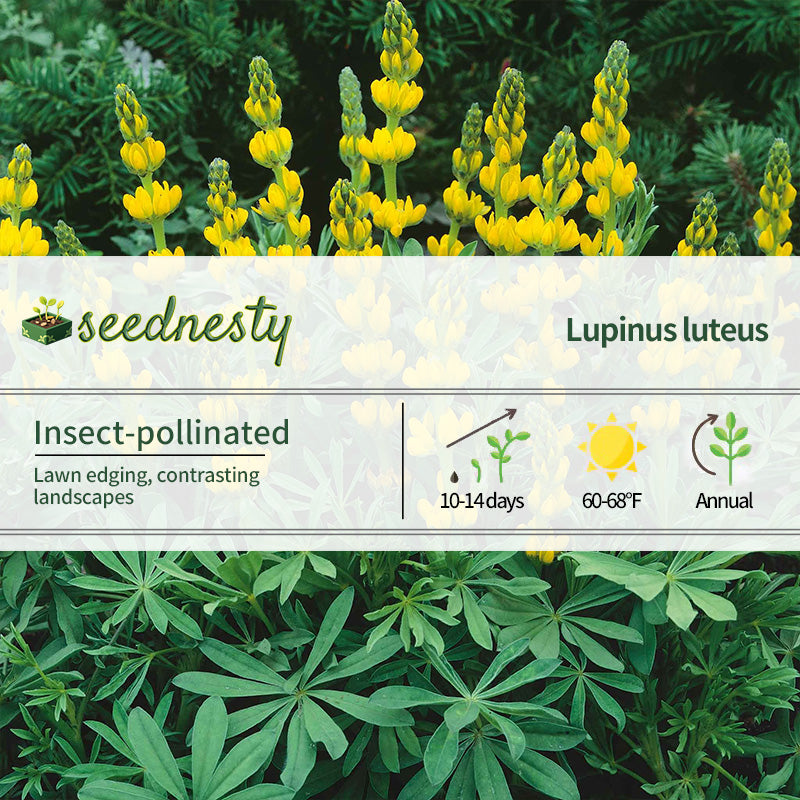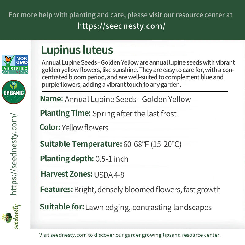 Annual Lupine Seeds - Golden Yellow focuses on vibrant color. Its pure yellow flowers are as dazzling as sunshine, and the flower spikes are full and compact, with multiple blooms per plant. Sow in spring, the flowers bloom in large clusters throughout the summer, lasting approximately 4-6 weeks, bringing vibrant energy to any garden. As an annual, it grows quickly, eliminating the need to wait for years for repeated blooms. It's a great choice for beginners or as a temporary landscape addition. With a height of approximately 18-22 inches and a wide plant, it's ideal for planting in front rows of flower borders, along lawn edges, or in pots. Paired with blue or purple lupines or lavender, it creates a classic "yellow and blue contrast" effect for a striking visual effect.