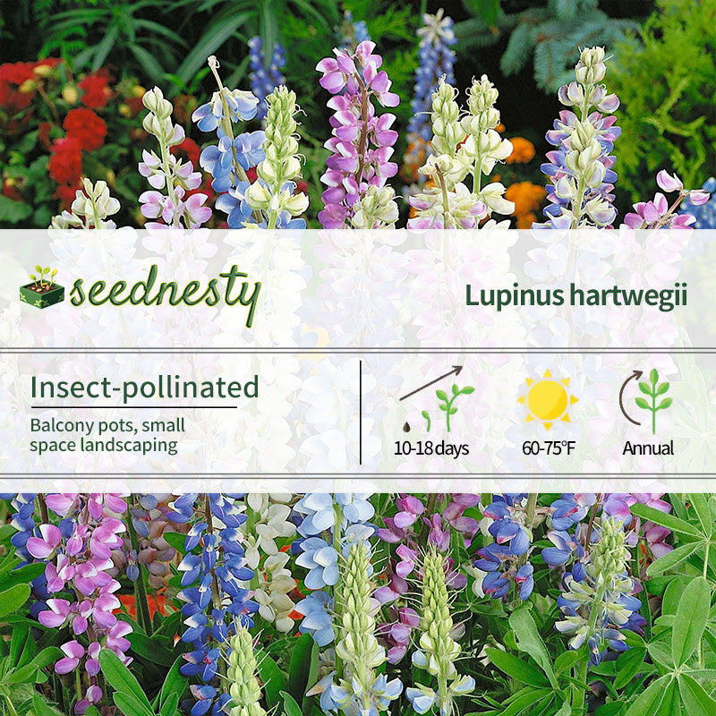 Lupine Seeds - Hartwegii Mix (Hartwegii Mix) is characterized by its vibrant, light colors, including purple and blue. Its flower spikes are slender, approximately 8-12 inches long, and when in bloom, they resemble "colorful feathers," creating a fresh, soft flowerscape. This variety tolerates mild heat better than other lupines and can thrive in summer temperatures up to 30°C, making it suitable for parts of the South or for balcony pots. Mature plants reach a compact height of approximately 12-16 inches, requiring no extra space and are suitable for small balcony pots, small garden beds, or combined flower boxes. It has low soil requirements; ordinary garden soil with a small amount of leaf mold will suffice. Daily care requires ample sunlight and moderate watering, avoiding standing water.