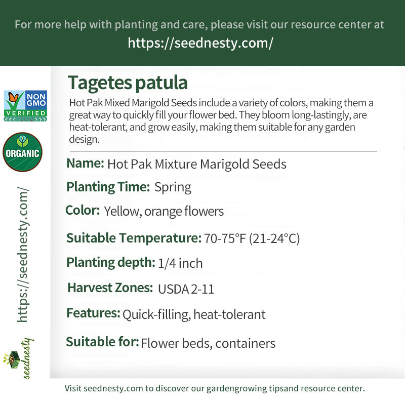 Hot Pak Mixed Marigold Seeds is a diverse assortment of marigold seeds, including a variety of colors like yellow and orange, perfect for quickly filling your flower bed. These fast-growing plants are heat-tolerant and thrive in full sun. Their long blooming period, from summer to fall, adds a vibrant color to your garden. They require only moderate moisture during planting and are easy to care for, making them an ideal choice for any garden design.