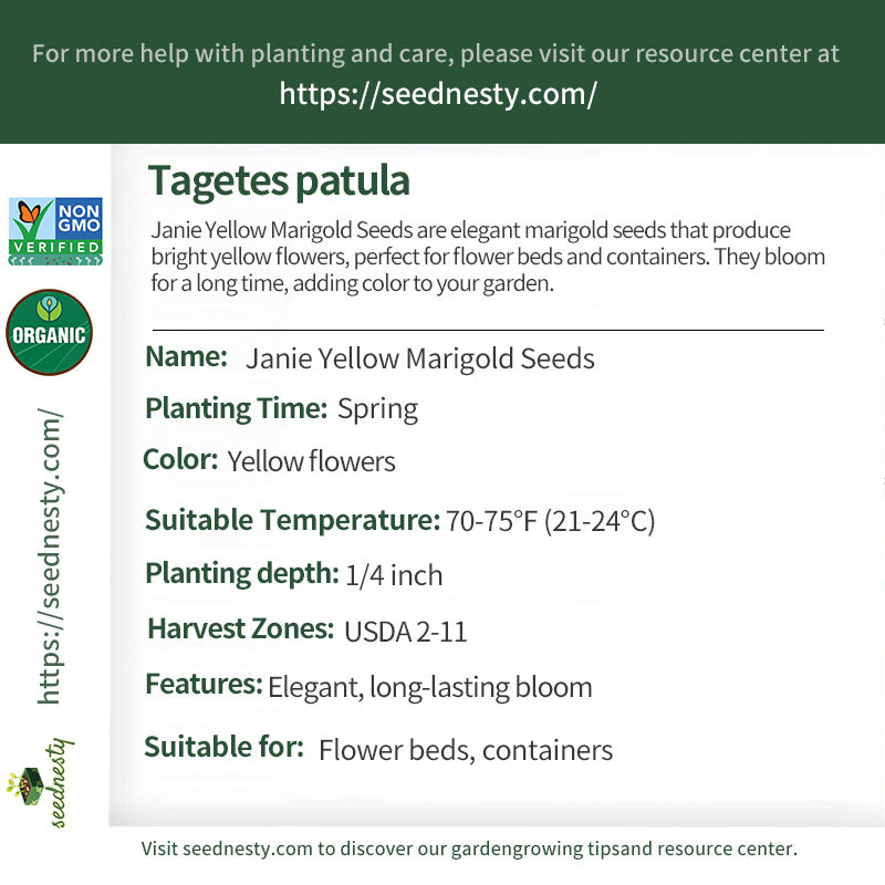 Janie Yellow Marigold Seeds are elegant marigold seeds that produce bright yellow flowers, perfect for flower beds and containers. These fast-growing plants are heat-tolerant and thrive in full sun. Their long blooming period, from summer to fall, adds color and vitality to any garden. Not only are Janie Yellow marigolds beautiful, they also attract bees and butterflies, contributing to a healthy environment. They are easy to care for, requiring only adequate water and sunlight, making them an ideal gardening choice.