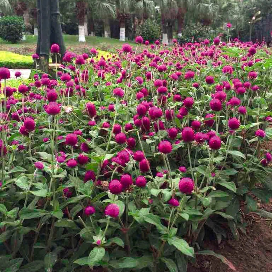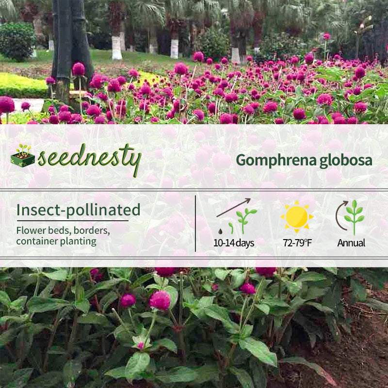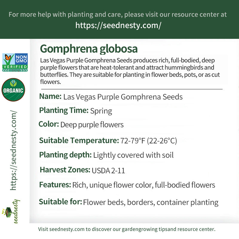 Las Vegas Purple Gomphrena Seeds produces striking flowers. Its flowers are approximately one-inch in diameter, spherical and full, with rich, inky purple bracts dotted with small white petals. The unique coloration makes it highly ornamental. This variety tolerates heat, humidity, and pests, performing exceptionally well in hot summers and has been certified as a "heat-tolerant plant" by the Dallas Arboretum and Botanical Garden. Flowering typically takes less than three months from sowing, spanning early to late summer. It prefers full sun and is not picky about soil, though it requires well-drained, fertile garden soil or potting soil. It is suitable for use in flower beds and borders and also makes excellent cut and dried flowers. It attracts butterflies and hummingbirds, adding vibrant beauty to any garden.