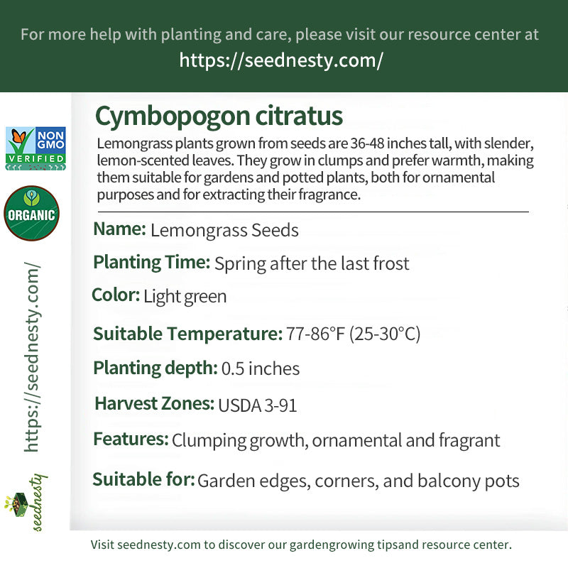 Lemongrass plants grown from seeds offer both ornamental and aromatic value. They grow 36-48 inches tall, with slender, linear, light green leaves that grow in clumps, forming dense, "grass-like" masses. These leaves are tough, with slightly serrated edges, and offer a refreshing lemony aroma that is soothing to the touch. This variety prefers warm conditions and is suitable for outdoor cultivation in frost-free areas. It can be potted in northern regions and moved indoors for wintering. It requires minimal care during its growth period; sufficient sunlight and moist soil are all that's needed for rapid growth. The leaves can be cut as they grow, and the cut leaves can be used for indoor fragrance diffusers and flower arrangements, adding a natural lemony fragrance to any space.