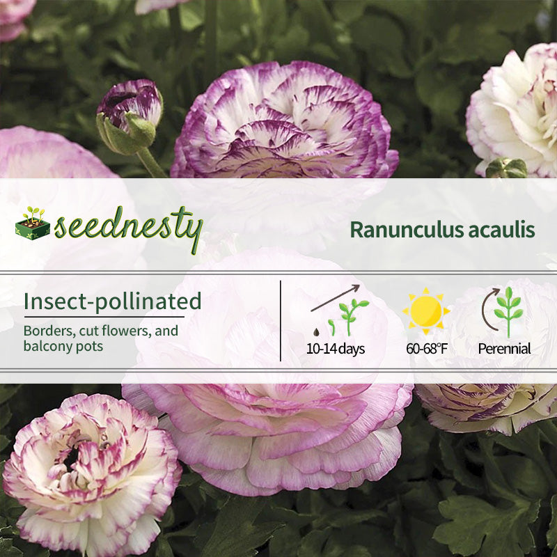 Mache Bicolor Mix Ranunculus Seeds feature a classic "contrasting" color scheme. The seeds contain a classic purple and white color combination, and some flowers feature a striking contrast between the inner and outer petals, creating a striking visual impact. The flowers are densely packed, with layers of petals resembling miniature peonies, measuring approximately 3-4 inches in diameter. The petals have slightly serrated edges, adding a touch of refinement. The plant grows approximately 12-18 inches tall, with a slender yet sturdy stem supporting the double petals and preventing them from falling over. The leaves are palmately divided, light and emerald green, without obscuring the flowers. It prefers a cool, dry environment, ideally suited to temperatures between 10-20°C. It blooms from early spring to early summer, with individual flowers remaining open for 10-14 days. Suitable for the front row of a border or paired with a single-colored ranunculus to create a layer of color.