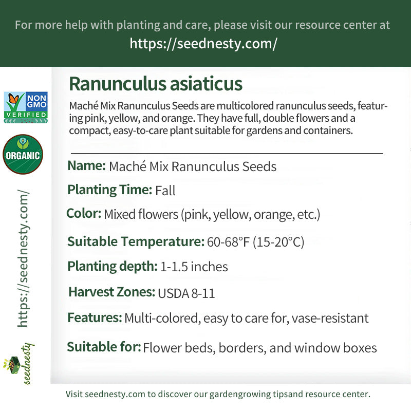 Maché Mix Ranunculus Seeds is a classic multicolored ranunculus combination, featuring saturated hues of pink, yellow, and orange, offering a comprehensive color palette suitable for diverse landscape applications. The flowers are full, double, with numerous, evenly arranged petals, measuring approximately 2.5-3.5 inches in diameter. When in bloom, they resemble "mini-peonies," with some flowers having a subtle sheen that enhances their beauty in sunlight. The plants grow approximately 10-16 inches tall, forming a compact, clumping plant. The palmately divided leaves create a striking contrast between the vibrant colors and the vibrant green. They prefer a cool, dry environment and avoid high temperatures and humidity. The ideal germination temperature is 15-18°C. The flowering period lasts from early spring to early summer, with up to 5-8 flowers per plant. The seeds germinate easily and are easy to care for, making them suitable for beginners.
