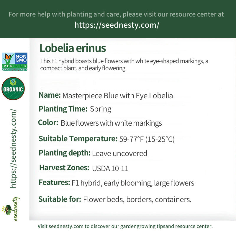 Masterpiece Blue with Eye Lobelia seeds produce compact plants with blue flowers with distinctive white eye-shaped markings, large, and highly ornamental. As an F1 hybrid, it offers excellent garden performance, blooming early and continuing from late spring to mid-autumn. This variety is well-adapted and heat-tolerant, growing well in full sun or partial shade. It is suitable for patio pots, small garden beds, and borders.