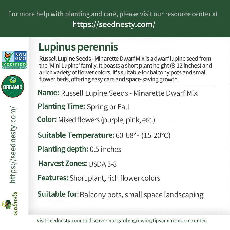Russell Lupine Seeds - Minarette Dwarf Mix is a dwarf lupine seed designed specifically for small spaces. Reaching only 8-12 inches tall, it's significantly shorter than regular lupines, eliminating the need for excessive growth and space. It's ideal for balcony pots, window boxes, or small garden beds. The seeds contain a variety of mixed colors, including purple and pink. Despite its short stature, the flower spikes are full and compact, and a single plant can produce multiple flower spikes simultaneously, creating a vibrant and visually appealing plant. This variety is easy to care for and requires no extensive pruning. Simply ensure ample sunlight and moderate watering, rehydrating when the soil dries out. Even novice gardeners can easily manage it. Its cold tolerance is comparable to that of regular lupines, and its flowering period lasts from late spring to early summer, bringing vibrant color to small spaces.