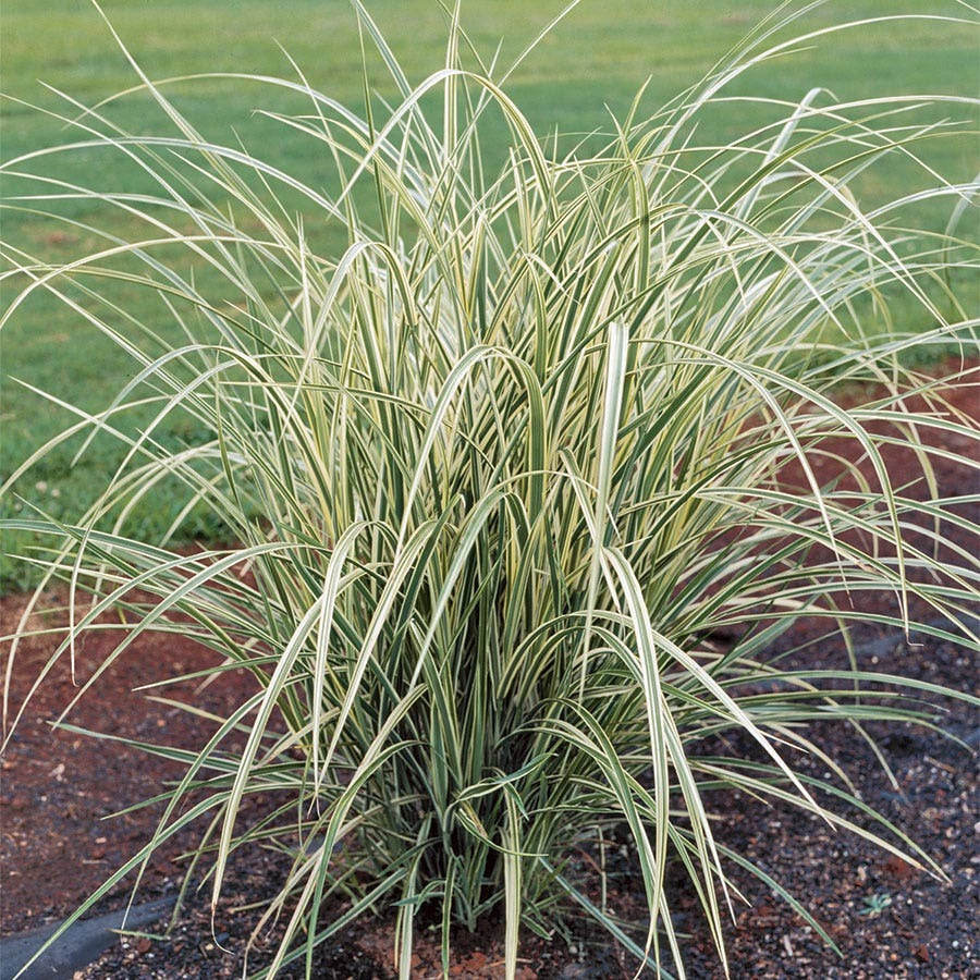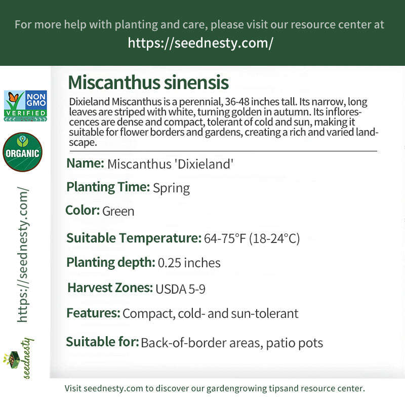 Miscanthus 'Dixieland' is a classic small- to medium-sized ornamental Miscanthus, perfect for gardens with limited space. The plant grows in a clumping pattern, 36-48 inches tall, with a compact, yet not loose, shape. Its narrow, long, linear leaves are marked by a thin white vertical stripe running through the dark green, resembling a "green ribbon with a white border," making it instantly recognizable. The leaves are airy and translucent in summer, while the white stripe becomes even brighter in autumn. In late summer and early autumn, the panicles of inflorescences, 8-10 inches long and upright, emerge from the leaves, making them lightweight and not bulky. This variety is highly cold-tolerant, drought-tolerant, and sun-tolerant. It requires minimal soil requirements, as long as drainage is ensured, and can grow in full sun or partial shade.
