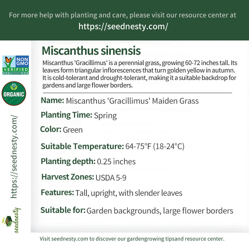 Miscanthus 'Gracillimus' is a perfect backdrop for large gardens. As a tall perennial ornamental grass, it grows 60-72 inches (5-6 feet) tall. Its leaves are slender, linear, and only 0.2-0.3 inches wide. They are green and clustered from the base, spreading upwards to form a transparent "grass screen." In autumn, it produces triangular inflorescences that are 12-18 inches long and stand upright or slightly drooping. These inflorescences, combined with the slender leaves, create a light, effortless effect. In late autumn, the leaves gradually turn golden yellow. Although the leaves wither in winter, the dead plant maintains its upright appearance, providing a beautiful winter landscape for the garden. This variety is cold-tolerant (to -23°C), drought-tolerant, and heat-tolerant, with a wide range of soil adaptability, and grows best in full sun.